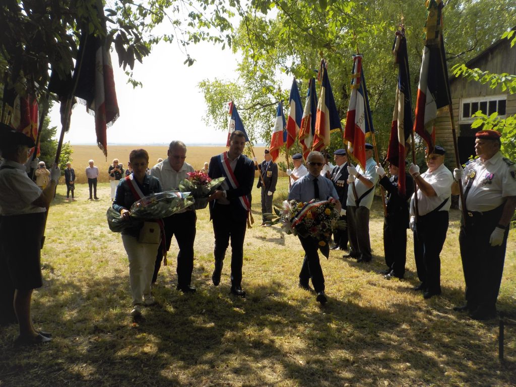 Mrs. Bernier et Guitton, Mme Battelier ont à leur tour pris la parole. Puis la fanfare « Les Intrépides » de Nogent-sur-Aube a entamé le chant des partisans suivi de l’appel aux morts, le salut des porte-drapeaux à la stèle, l’hymne anglais et la Marseillaise. Ensemble, Mrs Martin, Bernier, Guitton et Mme battelier ont déposé une gerbe.